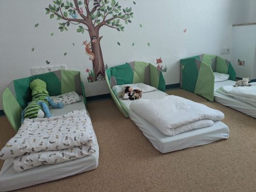 Für die U3-Kinder steht ein großzügiger Schlaf- und Ruheraum zur Verfügung, den die Kinder ihrem Bedarf entsprechend nutzen können.
